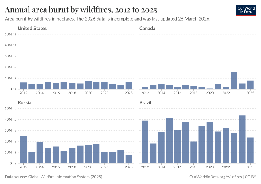 Veronika Samborska and Hannah Ritchie (2024) - “Wildfires” Published online at OurWorldinData.org. Retrieved from: 'https://data-forest-share-update.owid.pages.dev/wildfires' [Online Resource]BibTeX citation