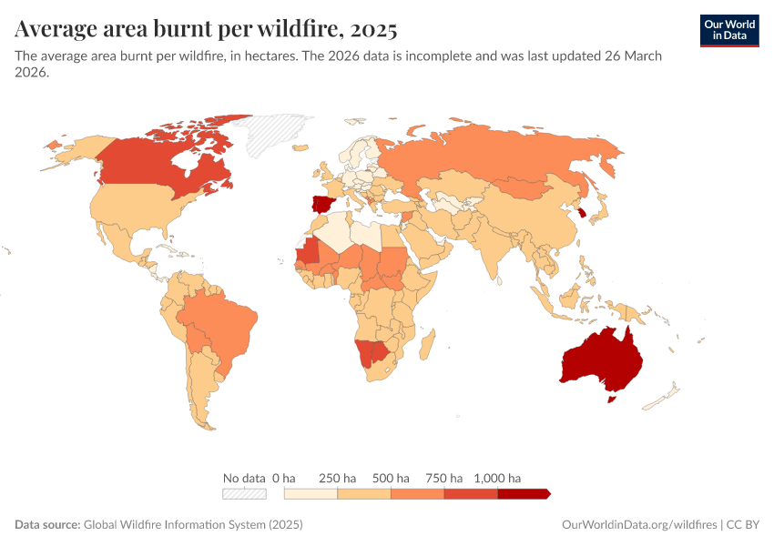 In the chart below, you can explore how the average land area burnt per wildfire varies across different countries and regions. As before, the current year’s data is included but will remain incomplete until the end of the fire season. You can further explore in this scatterplot how the same number of wildfires can lead to significantly different amounts of land being burnt per wildfire.